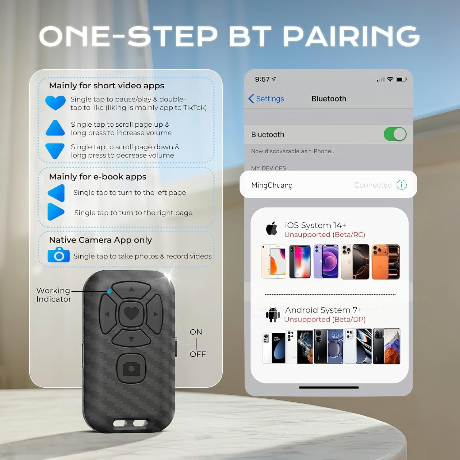 The included remote control is widely compatible with both iPhone (iOS 14+) and Android phones (Android 7+). It pairs easily and maintains a stable connection, offering up to 7 days of battery life - no more worries about frequent charging.