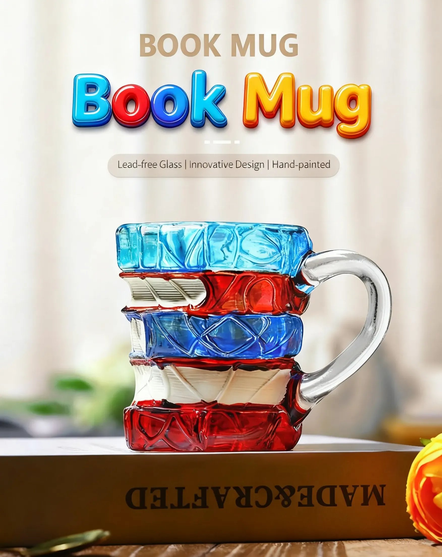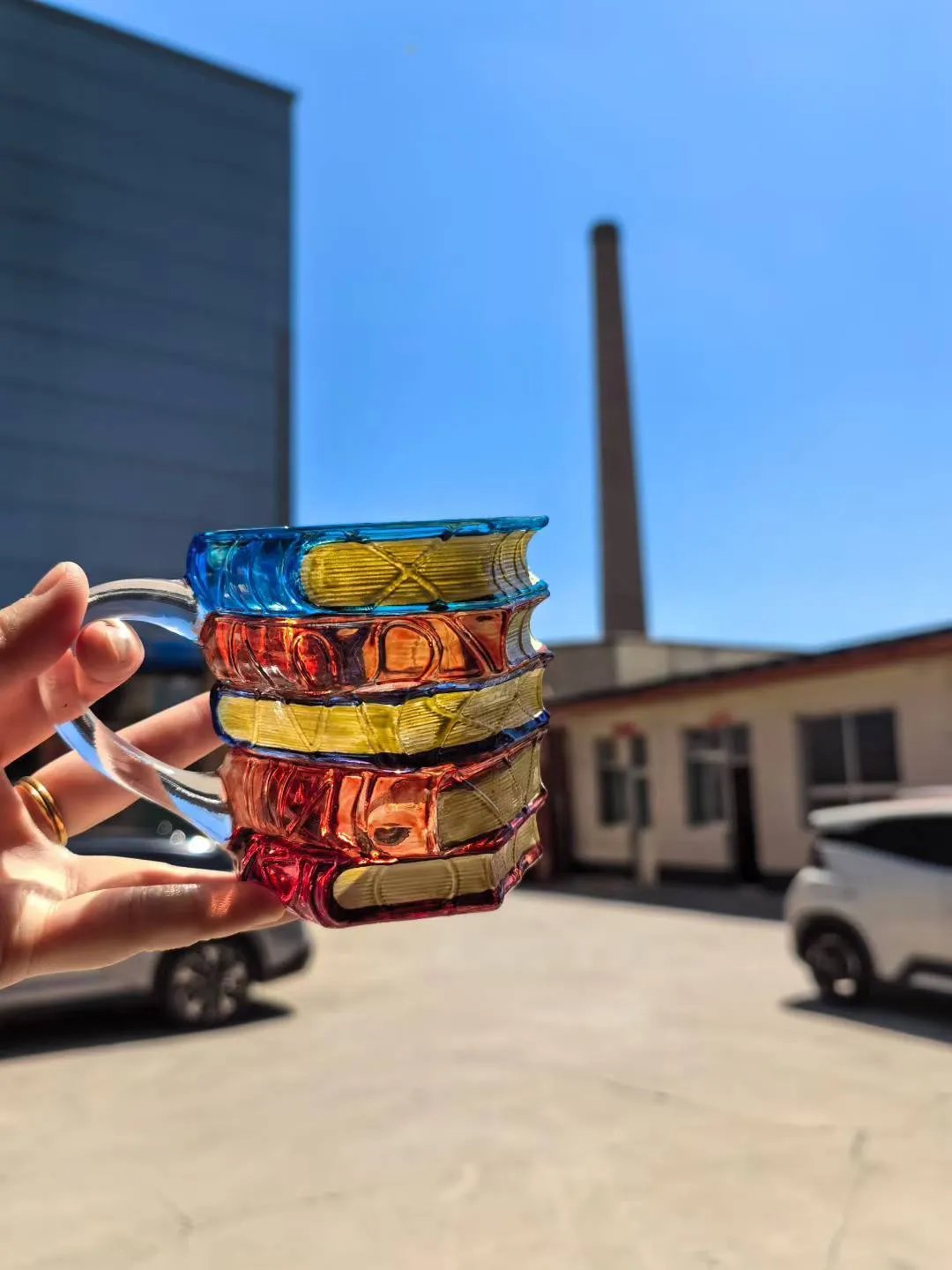 Crafted with premium, food-grade glass, each “stacked book” shines in vibrant blues, warm oranges, and rich reds. The glossy finish and realistic book-spine details make the mug feel magical—especially when the light hits it.