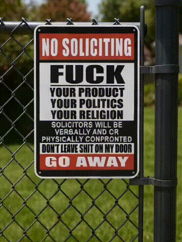 No Soliciting "F" Your Products Go Away Own Risk Sign