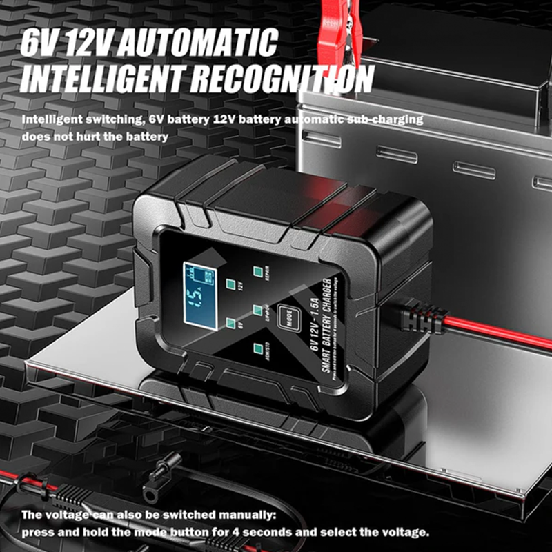 Fully Automatic Operation of Smart Battery Maintainer: The LCD display shows charging status, and adaptive charging restores full power if battery voltage drops under load. The automatic cycle switches to float mode once the battery is fully charged, ensuring optimal performance.