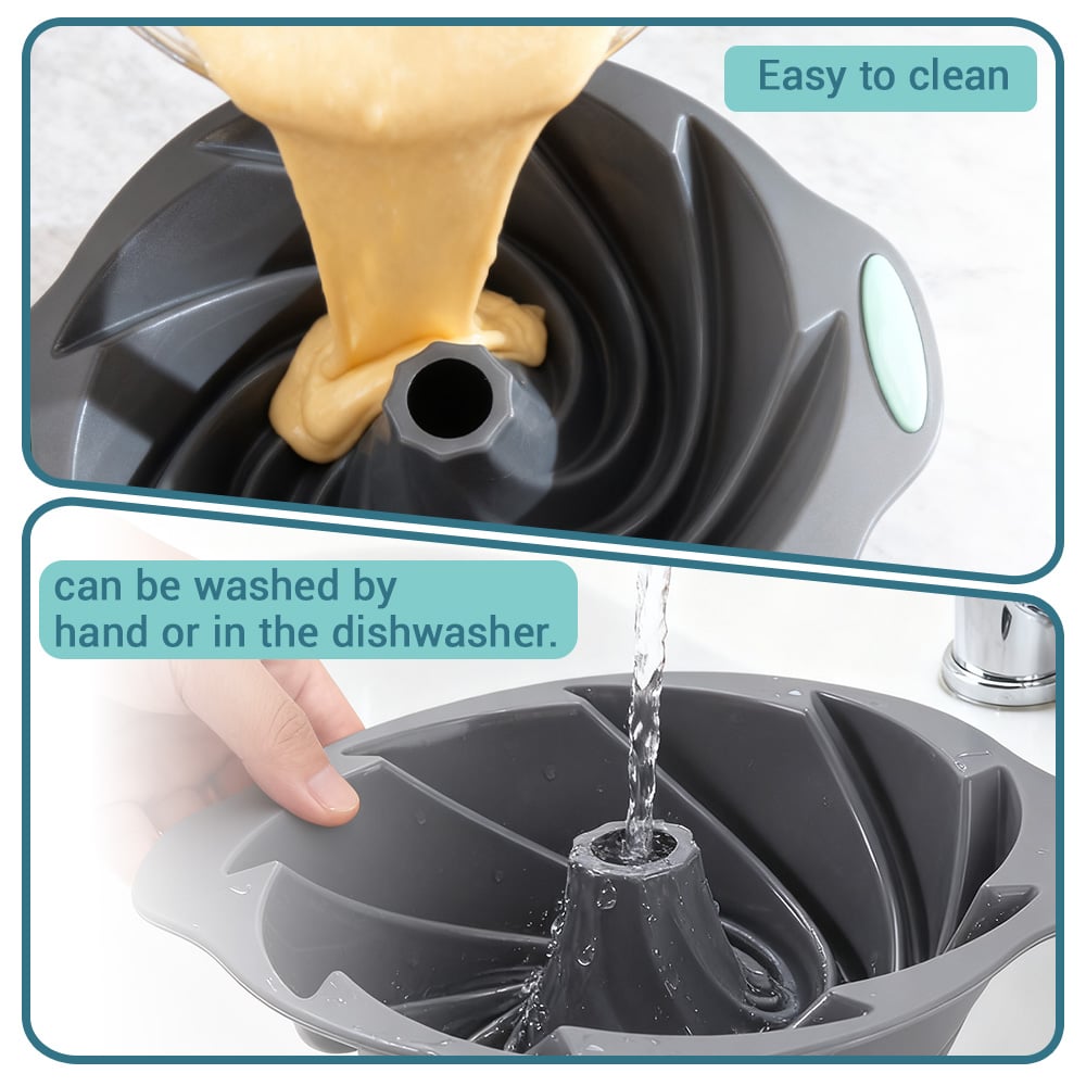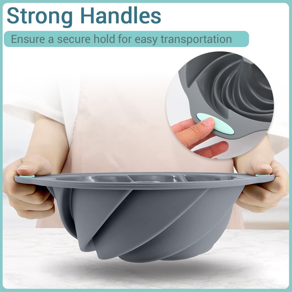 Reinforced metal frame provides reliable strength for long-lasting performance. Strong Side handles make it secure to transport the silicone bunte cake pan to and from the oven.