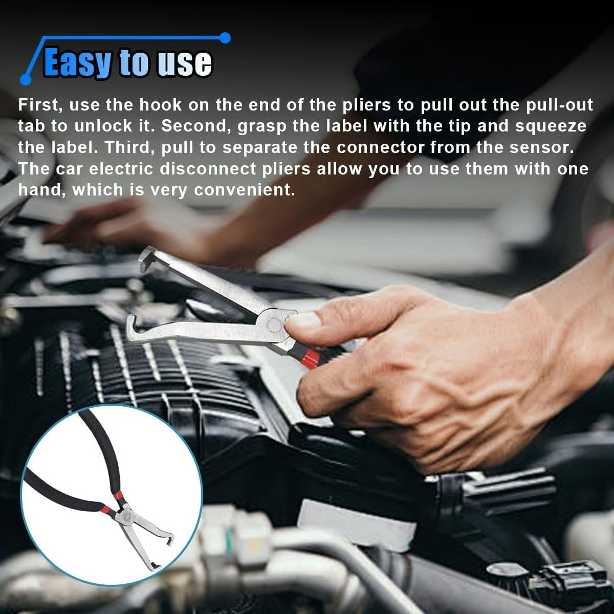 Using these pliers is a breeze! First, hook the end to pull out the locking tab. Next, grasp the tab and squeeze to release it. Finally, pull to separate the connector from the sensor. Designed for one-handed use, they offer convenience and efficiency for all your electrical tasks
